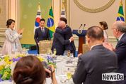 뉴스다 최광묵 기자 | 이재명 대통령 부부는 23일 저녁, 국빈 방한 중인 룰라 다 시우바 대통령 부부와 브라질 대표단을 청와대 영빈관으로 초청해 만찬을 함께 했다. 만찬에는 강훈식 비서실장과 위성락 국가안보실장, 김용범 정책실장 등 청와대 참모들과 구윤철 부총리 겸 재정경제부 장관, 배경훈 부총리 겸 과학기술정보통신부 장관 등 정부 인사들, 제22대 국회 한-브 의원 친선협회 협회장인 박정 의원 등 정계인사들과 이재용 삼성그룹 회장, 최태원 SK그룹 회장, 구광모 LG그룹 회장, 정의선 현대차그룹 회장, 한국경영자총협회장을 맡고 있는 손경식 CJ그룹 회장 등 재계 인사들, 세징야 대구 FC 축구선수, 이승연 화가 등 학계와 문화계, 친선협회 인사들 120여 명이 참석했다. 이재명 대통령은 만찬사를 통해 소년공 시절을 회고하면서 “몸으로 배운 노동의 가치와 인간의 존엄성은 더 나은 세상을 바라는 열망의 원동력이 됐다”고 언급했다. 이어 “비슷한 삶의 궤적을 공유하고 있었기에 룰라 대통령님을 처음 만났을 때부터 마치 오랜 친구를, 또 동지를 만난 것처럼 무척이나 반가웠다”고 전했다. 또한 삼성, LG, 현대