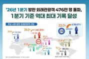 뉴스다 최광묵 기자 | 문화체육관광부는 올해 1분기(1~3월) 한국을 방문한 외국인 관광객이 약 476만 명을 기록하며, 3월 중동사태 발생에도 불구하고 1분기 기준 역대 최대 규모를 달성했다고 밝혔다. 이는 2025년 같은 기간 대비 23% 증가한 수치이며, 특히 3월에는 외래객 약 206만 명이 방한해 월별 기준으로도 최대 실적을 경신했다. ‘케이-컬처’의 세계적 인기와 더불어 민관의 적극적인 외래관광객 유치 노력이 결실을 본 것으로 분석된다. 시장별로 보면, 중국 관광객이 145만 명(+29%)을 돌파하며 가장 큰 비중을 차지했고, 일본 관광객도 94만 명(+20.2%)이 한국을 찾으며 성장세를 이어갔다. 대만 관광객은 54만 명(+37.7%)까지 증가하여 주요 시장 중 증가세가 가장 두드러졌다. 그 외 미국, 유럽 등 원거리 시장 외래객도 69만 명(+17.1%)으로 증가하며 방한 시장 다변화를 이끌었다. 올해 1분기에는 크루즈 관광 시장의 성장도 돋보였다. 제주·부산·인천 등 주요 기항지로 입항한 크루즈선은 총 338척(항차 기준)으로 전년 같은 기간 대비 52.9% 증가했다. 이는 정부가 추진해 온 기항지 관