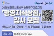 뉴스다 최광묵 기자 | 광명시 평생학습원이 시민 맞춤형 평생학습 프로그램 ‘광명지식상점’을 운영할 2026년도 전문 교육 강사를 공개 모집한다. ‘광명지식상점’은 시민의 삶과 밀접한 주제를 중심으로 배움과 성장을 지원하는 광명시 대표 평생학습 프로그램이다. 2026년에는 ▲미래기술 ▲직무역량 ▲재무설계 ▲인문성찰 ▲관계학습 ▲시민학습 ▲기타 제안과정 등 7개 분야에서 강사를 선발해 시민들에게 다채로운 교육 서비스를 제공할 예정이다. 지원 자격은 해당 모집 분야의 전문성을 보유하고 관련 자격증과 실무경력을 모두 갖춘 자에 한한다. 시는 강의 경력, 강의계획서, 자기소개서 등을 바탕으로 1차 서류심사를 진행한 뒤, 수업 시연과 질의응답으로 구성된 2차 면접심사를 거쳐 최종 40여 명의 강사를 선발할 계획이다. 접수는 오는 12일부터 19일 17시까지 이메일 또는 평생학습원 2층 사무실 방문을 통해 가능하다. 제출 서류 등 세부 사항은 광명시 평생학습플랫폼 ‘광명이(e)지’ 공지사항에서 확인할 수 있다. 최종 합격자는 2월 중 ‘광명e지’에서 발표하며, 선발된 강사진은 3월부터 본격적으로