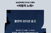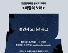 뉴스다 최광묵 기자 | 성남문화재단은 콘서트 오페라 ‘바람의 노래’ 무대를 빛낼 주역 성악가를 선발하는 오디션을 개최한다. 콘서트 오페라 ‘바람의 노래’는 오페라를 더 친근하게 즐길 수 있도록 기획된 ‘2026 오페라 정원’ 시리즈의 작품 중 하나로, 지난해 재단이 제작한 창작 오페라를 콘서트 오페라 형식으로 재구성해 선보이는 공연이다. ‘바람의 노래’는 성남을 대표하는 작곡가 박태현 선생의 동요들을 모티프로, 한국전쟁 등 격동의 현대사 속에서도 동심을 지켜낸 동요의 힘을 예술적으로 풀어낸 작품이다. 재단은 지역 예술인 육성과 무대 참여 기회 확대를 위해 작품의 중심 배역인 테너 ‘달’ 역과 소프라노 ‘바람’ 역을 성남시에 거주하는 성악가를 대상으로 오디션을 통해 선발한다. 지원 자격은 4년제 음악대학 성악과 졸업 이상 또는 동등한 자격을 갖춘 자로, 공고일(4월 27일) 기준 성남시에 거주하고 있는 성악가를 대상으로 한다. 접수는 5월 11일부터 13일 오후 5시까지 온라인으로 진행된다. 오디션은 5월 19일 오후 2시부터 성남아트센터 콘서트홀에서 피아노 반주에 맞춘 지정곡 가창으로 진행되며,