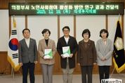 뉴스다 최광묵 기자 | 의정부시의회 ‘의정부시 노인사회참여 연구회’가 18일 연구용역 최종 결과를 집행부에 전달했다. 의정부시 노인사회참여 연구회는 조세일 대표의원과 김연균 의원, 정미영 의원으로 구성된 의원 연구단체로, 노인의 사회참여 현황과 효과를 분석하고 지역 맞춤형 정책 방안을 제시함으로써 노인의 삶의 질 향상과 세대 통합, 지역 공동체 회복을 위해 지난 5월부터 연구 활동을 돌입해 11월 연구 용역을 마쳤다. 연구회는 노인 관련 총괄 부서인 노인복지과에 노인의 사회참여 유형을 분류하고 방안을 제시하는 등에 대한 연구 결과를 토대로 작성된 연구용역 결과 보고서를 전달했다. 조세일 대표의원은 “이번 연구 결과를 바탕으로 담당부서와 협력하고 소통하여 노인사회참여 방안을 실체화하고 추진해 나갈 예정이다”라며, “고령사회 속에서 다양한 세대가 함께 공존할 수 있는 기반이 조성되길 바란다”라고 밝혔다.