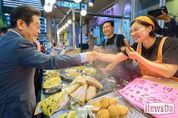 뉴스다 최광묵 기자 | 이재명 대통령은 판교에서 진행된 청년 스타트업 대표들과의 만남 후 성남시 태평동에 있는 현대시장을 약 30분가량 깜짝 방문했다. 현대시장은 이재명 대통령이 성남시장으로 재직하던 시절, 상권 활성화 사업을 통해 현대화가 된 곳이다. 상인들은 웃음과 박수, 환호로 대통령이 되어 돌아온 옛 성남시장을 반갑게 맞아주었다. 시장 초입에서 43년째 전집을 운영하고 있는 반재분 씨는 “성남시장 시절 자주 봤지만 대통령이 돼 못 볼 줄 알았는데 다시 보니 너무 반갑다”며 손을 꼭 잡았고 이 대통령은 웃음으로 화답했다. 얼굴이 낯익은 한 상인에게 이 대통령이 “더 젊어지신 것 같다”고 말을 건네자 상인은 “대통령님이 더 건강해지셔야 한다”고 덕담을 전했다. 또 다른 상인이 “성남시장 하실 때 꼬맹이던 아들이 중학생이 됐는데 대통령은 10년 전과 똑같다, 하나도 안 늙었다”고 말을 꺼내자 이 대통령은 “저는 제가 많이 늙은 줄 알았는데요?”라고 응수하며 웃음을 터트렸다. 이 대통령은 상인들과 일일이 악수를 하고 셀카 촬영 요청에 응하면서 체감 경기가 어떤지 물었다.