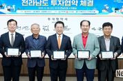 뉴스다 최광묵 기자 | 전라남도는 24일 도청 서재필실에서 ㈜성경식품, ㈜해진수산, ㈜해진식품 등 3개사와 투자금액 총 1천34억 원 규모의 투자협약을 했다고 밝혔다. 이번 투자로 302명의 신규 고용 창출도 기대된다. 이날 협약식에는 김영록 전남도지사를 비롯해 육현진 ㈜성경식품 대표, 김성윤 ㈜거해 대표, 임한택 ㈜해진수산·㈜해진식품 대표, 김희수 진도군수, 윤재광 영암부군수 등이 참석했다. ㈜성경식품은 자반김 전문업체 ㈜거해와 합작해 500억 원을 투자, 진도 군내농공단지에 생산시설을 구축한다. 최첨단 설비와 스마트 자동화 공정을 도입해 강화된 글로벌 위생 기준에 대응해 진도공장을 글로벌 수출 전진기지로 육성할 계획이다. 향후 조미김 등 완제품 가공 분야까지 투자 범위를 확대해 김 산업의 부가가치를 높여갈 예정이다. ㈜해진수산과 ㈜해진식품은 534억 원을 투입, 영암군에 마른김·조미김 생산라인을 구축한다. 해남에서 레미콘 기업을 운영해 온 임한택 대표의 식품산업 진출 사례로, 지역 내 식품 분야 투자 다각화를 촉진하는 모범 모델이 될 것으로 주목된다. 전