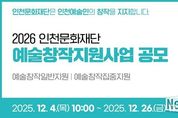 뉴스다 최광묵 기자 | 인천문화재단은 오는 12월 2026 예술창작지원사업 공모를 시작한다. 공모 분야는 예술창작일반지원, 예술창작집중지원으로 두 가지이다. 접수기간은 2025년 12월 4일부터 12월 26일까지이며, 국가문화예술지원시스템으로 온라인 신청을 받는다. 2026 예술창작지원사업 공모 계획은 분야별, 지역별 예술인 간담회에서 수렴한 현장 의견을 반영하여 마련됐다. 이번 공모의 주요 변경사항 중 하나는 지원자 책임 신청제 확대 시행이다. 2025년부터 추진하고 있는 행정 간소화 기조에 따라 2026년 공모사업은 신청 자격 증빙자료를 최종 선정 이후 제출하는 것으로 변경했다. 이에 예술인의 공모 신청 서류 준비에 대한 부담이 경감될 것으로 예상된다. 2026 예술창작지원사업 공모에 대한 자세한 사항은 인천문화재단 홈페이지 공지사항과 11월 26일 예정된 사업설명회(온라인: 오전 10시 30분, 오프라인: 15시)에서 확인할 수 있다.