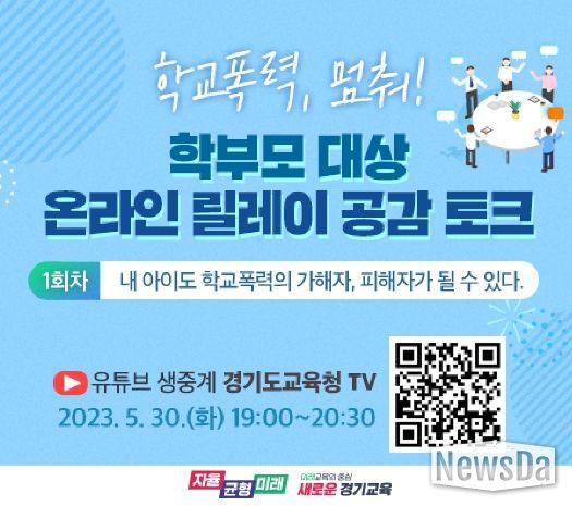 뉴스다 최광묵 기자 | 경기도교육청이 학교와 가정 연계 인성교육 강화로 학교폭력 없는 학교문화를 조성하기 위해 학부모 대상 ‘온라인 릴레이 공감 토크’를 30일 개최한다.