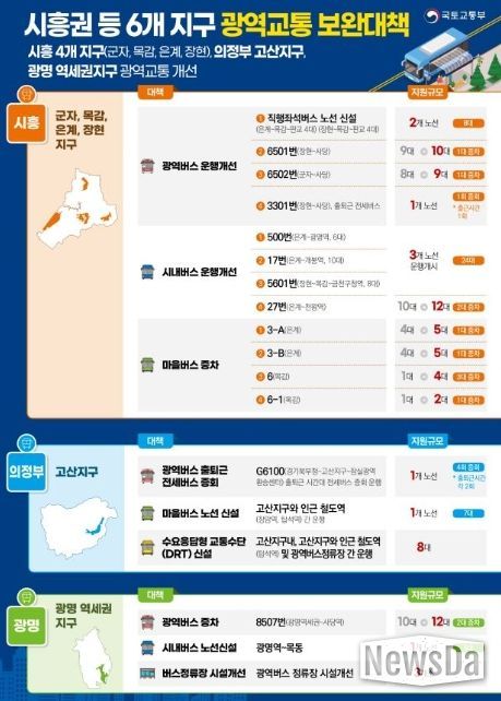 광역교통 개선 내용을 살펴보면, 은계~목감~판교노선, 장현~목감~판교 노선 등 광역버스 2개 노선(각 4대)이 신설된다. 또한, ▲6501번과 6502번 광역버스 각 1대 증차 ▲3301번 출근 1회 증회 ▲시내버스 3개 노선의 운행 개시 ▲27번 2대 증차 ▲마을버스 4개 노선에서 6대의 증차가 추진된다.