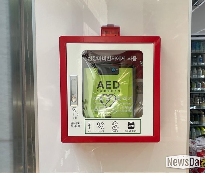 이는 급성심정지자 목격 시 골든타임에 자동심장충격기를 빠르게 적용하기 위한 취지로, CU편의점 출입구에는 ‘자동심장충격기 설치시설’ 안내 표지가 부착돼 있다.