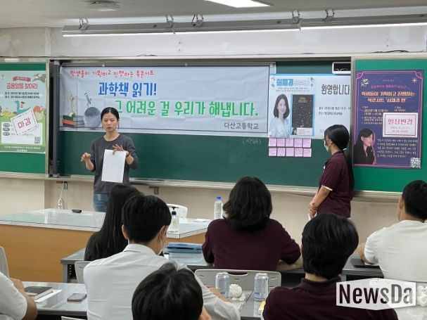뉴스다 최광묵 기자 | 탄소중립 중점학교로 지정된 이천 다산고(교장 이교상)는 지난 7일 한국천문연구원 심채경 박사를 초청하여 학생들이 기획하고 진행하는 ‘북콘서트-심채경 편’을 진행했다.