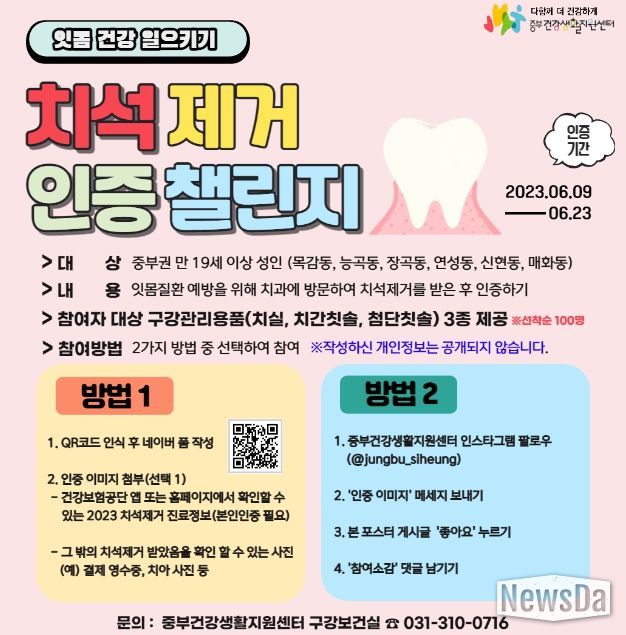 뉴스다 최광묵 기자 | 시흥시 중부건강생활지원센터가 중부권역 만 19세 이상 성인을 대상으로 오는 9일부터 23일까지 치석제거 인증 챌린지를 운영한다.