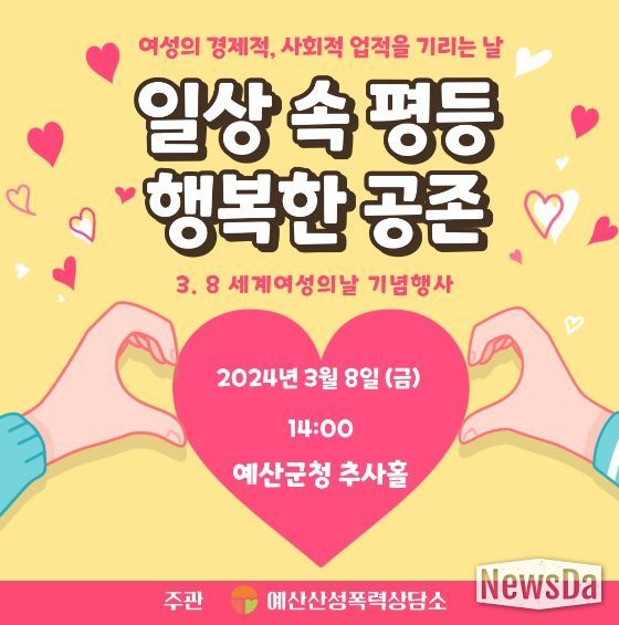 뉴스다 최광묵 기자 | 예산군은 지난 8일 115주년 세계여성의날의 기념하여 예산성폭력상담소 주관으로 3.8세계여성의날 기념행사를 추사홀에서 개최했다.