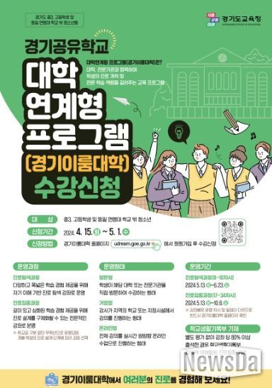 뉴스다 최광묵 기자 | 경기도교육청이 15일부터 다음달 1일까지 ‘2024 경기공유학교 대학연계형 프로그램(경기이룸대학)’ 참여 학생을 모집한다.
