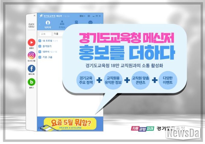 뉴스다 최광묵 기자 | 18만여 명의 교직원이 이용하는 메신저에 경기교육 정책에 대한 맞춤형 홍보 기능을 더했다. 경기교육에 대한 관심을 높이고, 일관성 있는 정책 추진을 위한 개방·소통·공감 행보의 일환이다.