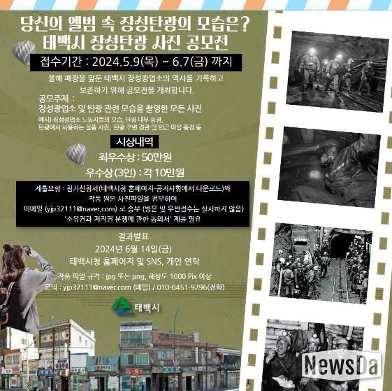 뉴스다 최광묵 기자 | 태백시는 오는 6월 7일까지 ‘태백시 장성탄광 사진/디카시 공모전’을 개최한다.