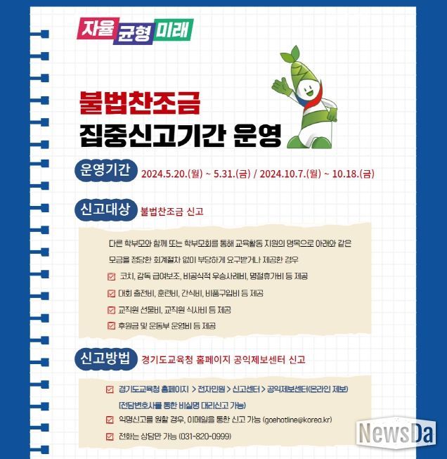 뉴스다 최광묵 기자 | 경기도교육청은 공정하고 투명한 경기교육의 가치를 실현하기 위해 부패취약분야별 집중신고기간을 운영한다.