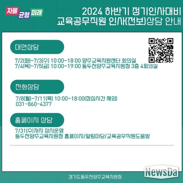 뉴스다 최광묵 기자 | 동두천양주교육지원청은 오는 7월 2일~7월 5일일까지 현장과 소통하는 적극적인 인사 행정 실현을 위해 동두천양주 지역 소속 교육공무직원을 대상으로 인사상담을 진행한다.