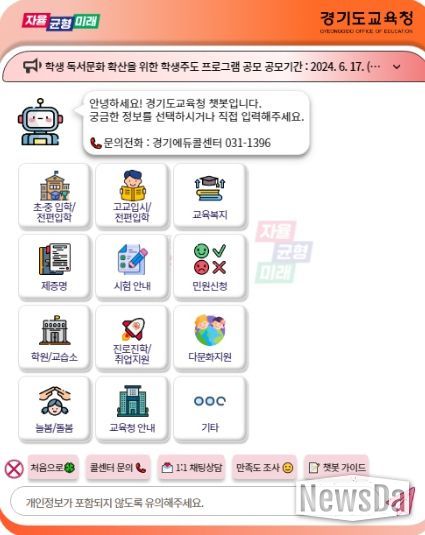 뉴스다 최광묵 기자 | 학교에 방문하지 않아도 온라인으로 언제 어디서나 민원 상담이 가능해진다. 사용할수록 똑똑해지는 인공지능(AI) 기반 챗봇 등을 통해 경기교육가족 모두의 원활한 소통을 지원한다.