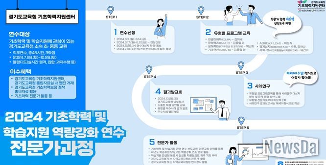 뉴스다 최광묵 기자 | 경기도교육청 기초학력지원센터는 7월 27일부터 10월 26일까지 경기도 초·중등 교원 140명을 대상으로'2024 기초학력 및 학습지원 역량강화 연수(전문가과정)'을 운영한다.