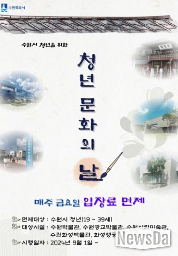 뉴스다 최광묵 기자 | 수원시가 청년들의 문화 의식을 높이고, 문화 활동 참여를 활성화하기 위해 매주 금요일을 ‘청년 문화의 날’로 지정하고, 수원시가 운영하는 문화시설의 입장료를 면제한다.