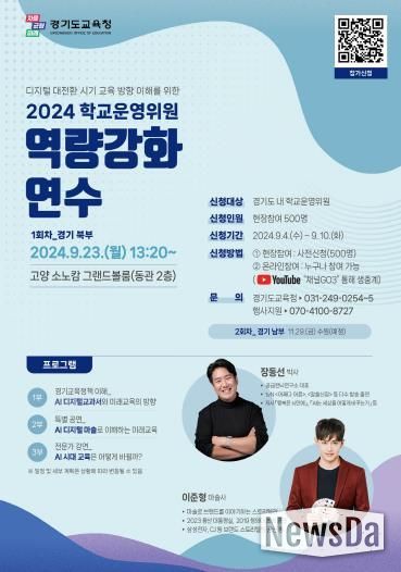 9월 연수 참가 희망자는 4일부터 학교 알림 및 포스터에 안내한 정보무늬(QR코드), 인터넷주소에 접속해 신청할 수 있다. 당일 현장 참석이 어려운 학교운영위원은 경기도교육청 유튜브 채널(GO3) 생중계로도 참여할 수 있다.