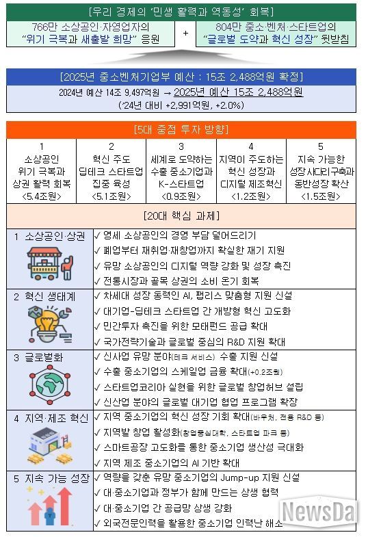 뉴스다 최광묵 기자 | 중소벤처기업부 2025년도 예산안 및 기금운용계획안 총지출 규모가 2024년 본예산(14조 9,497억원) 대비 2,991억원 증액된 15조 2,488억원으로, 12월 10일 국회 본회의에서 의결·확정됐다.