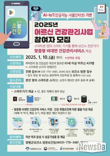 뉴스다 최광묵 기자 | 양평군은 65세 이상 어르신을 대상으로 한 비대면 건강관리 사업 참여자를 10일부터 모집한다고 밝혔다.