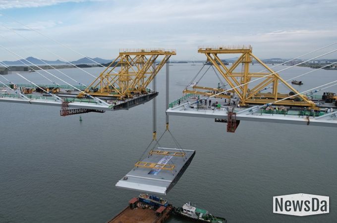 이날 공사는 다리 위 총 67개 상판 가운데 사장교 2개의 주탑 중앙에 위치한 길이 15m, 너비 33m, 무게 198t의 강재 상판을 최종 거치하는 것으로, 윤원석 인천경제자유구역청장과 관계 공무원 등이 지켜보는 가운데 성공적으로 마무리 됐다.