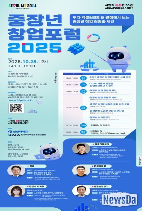 뉴스다 최광묵 기자 | 서울시가 중장년 창업지원의 성과를 시민과 공유하고, 창업 해법을 모색하기 위해'중장년 창업포럼 2025'를 개최한다.