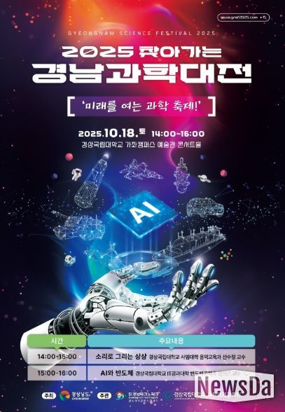 뉴스다 최광묵 기자 | 경상남도는 18일 경상국립대학교 가좌캠퍼스(진주) 예술관 콘서트홀에서 2025 찾아가는 경남과학대전을 개최한다.