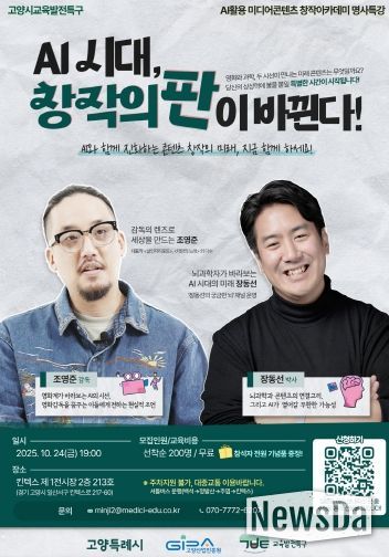 뉴스다 최광묵 기자 | 고양산업진흥원은 오는 24일 오후 7시, 킨텍스 제1전시장 213호에서 명사특강 ‘AI시대, 창작의 판이 바뀐다!’를 개최한다.