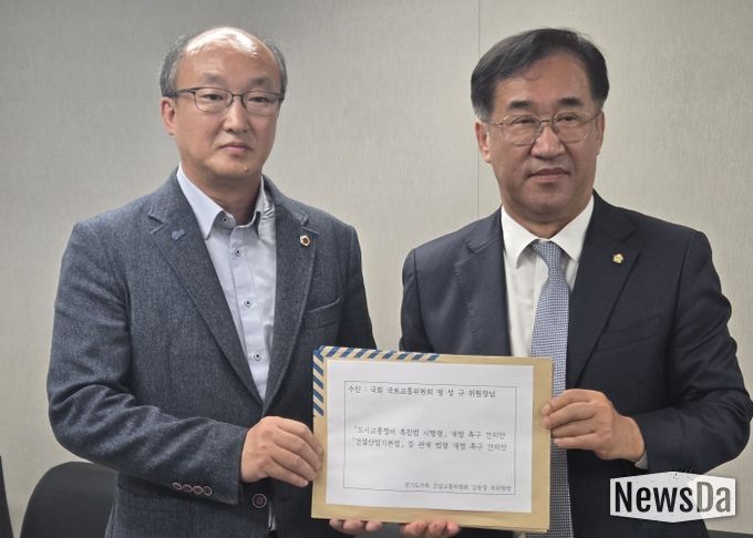 뉴스다 최광묵 기자 | 경기도의회 건설교통위원회 김동영 부위원장(더불어민주당, 남양주 오남)은 20일 경기도청 율곡홀에서 열린 2025년 국회 국토교통위원회 국정감사 현장을 찾아, 국회 국토교통위원회 맹성규 위원장에게 '도시교통정비 촉진법 시행령' 개정 촉구 건의안과 '건설산업기본법' 개정 촉구 건의안 등 경기도의회가 의결한 두 건의 건의안을 전달했다.