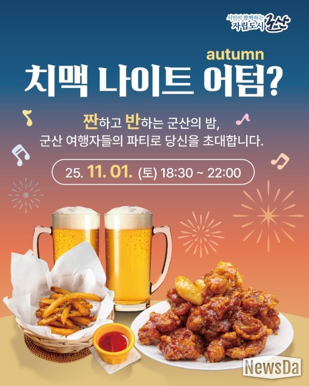 뉴스다 최광묵 기자 | 깊어가는 가을밤, 군산시가 탁 트인 야외에서 즐기는 특별한 행사 ‘치맥나이트 어텀(Autumn)?’을 11월 1일 저녁 군산 내항 일원에서 개최한다.