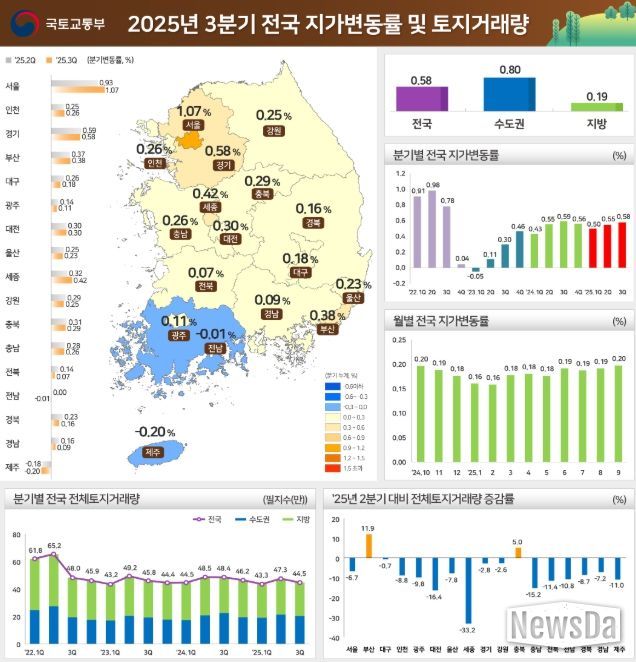 뉴스다 최광묵 기자 | 국토교통부와 한국부동산원(원장 손태락)은 '25년 3분기 지가변동률 및 토지거래량을 발표했다.