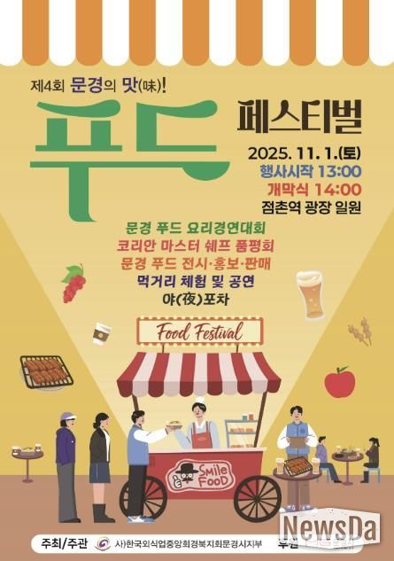뉴스다 최광묵 기자 | 문경시는 오는 11월 1일 점촌역 광장에서 한국외식업중앙회 경북문경시지부 주최·주관으로 '제4회 문경의 맛! 푸드페스티벌'을 개최한다.