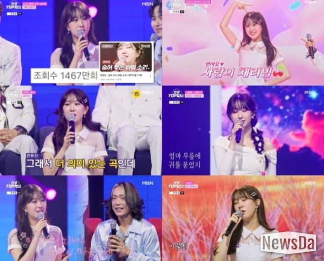 전유진은 지난 28일 밤 방송된 MBN ‘한일톱텐쇼’에 ‘미녀 삼총사’ 타이틀로 등장해 신곡 무대에서부터 밝고 상큼한 매력까지 뽐내며 시청자들의 시선을 사로잡았다.