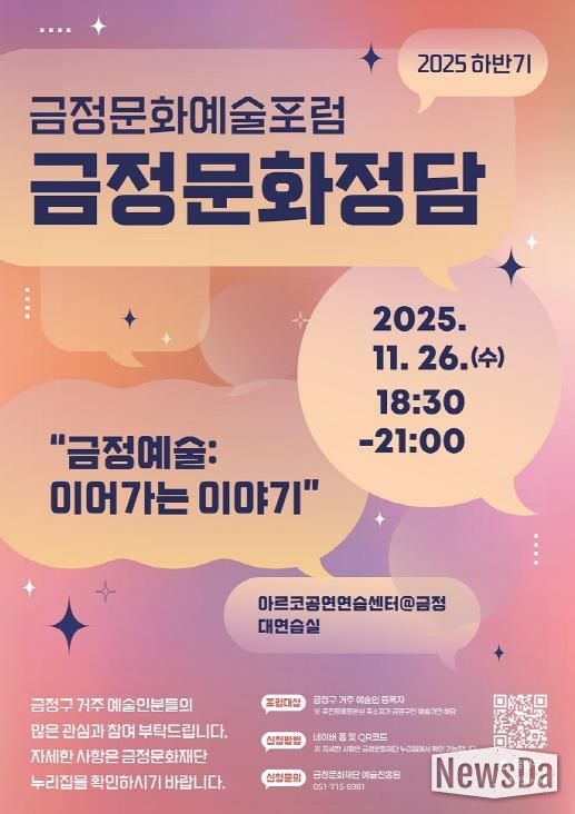 뉴스다 최광묵 기자 | 부산시 금정구 금정문화재단은 금정구 예술인과 함께 지역 문화예술의 현안을 공유하고 미래 발전 방향을 모색하기 위한 2025 하반기 금정문화예술포럼 '금정문화정담'을 오는 11월 26일 오후 6시 30분, 아르코공연연습센터@금정 대연습실에서 개최한다고 밝혔다.