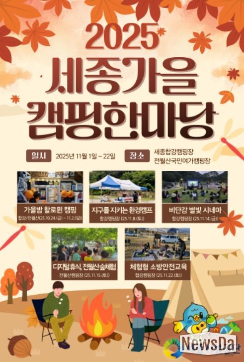 뉴스다 최광묵 기자 | 세종특별자치시시설관리공단은 11월 한 달간 세종합강캠핑장과 전월산국민여가캠핑장에서 ‘2025 세종가을캠핑 한마당’을 운영한다고 밝혔다.