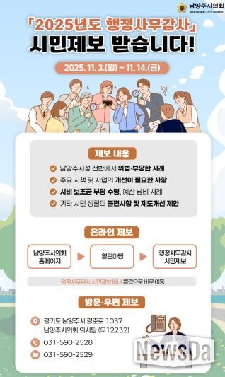 뉴스다 최광묵 기자 | 남양주시의회는 2025년 행정사무감사를 앞두고 11월 3일부터 14일까지 12일간에 걸쳐 시민제보를 받는다고 31일 밝혔다.
