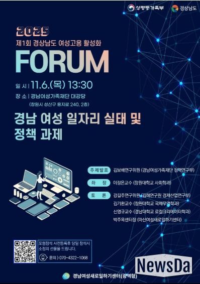 뉴스다 최광묵 기자 | 경남도는 오는 11월 6일 오후 1시 30분 경남여성가족재단 대강당에서 ‘2025년 경상남도 여성 고용 활성화 포럼’을 개최한다고 밝혔다.