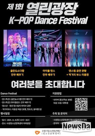 뉴스다 최광묵 기자 | 수원시청소년청년재단 청소년문화센터는 2025년 11월 8일 야외광장에서 청소년·청년이 함께 즐기는 가을 문화행사 열린광장 '청소년·청년 댄스 페스티벌'을 개최한다.