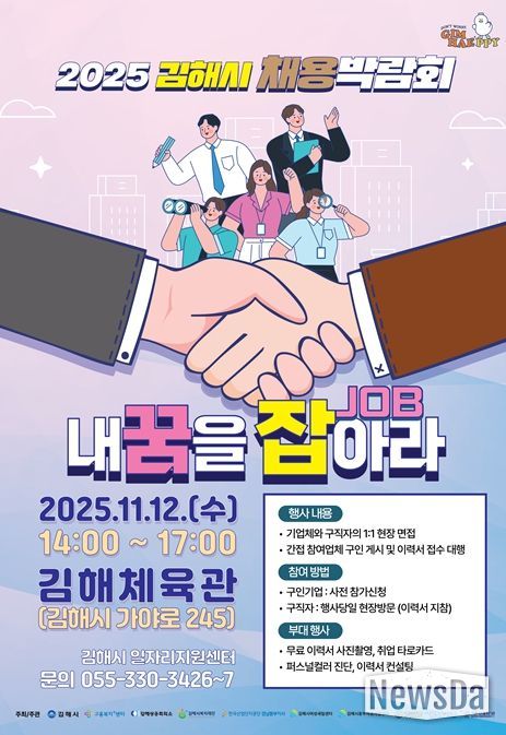 뉴스다 최광묵 기자 | 김해시는 지역 우수 기업의 인력난 해소와 구직자들의 취업 성공을 위해 오는 12일 오후 2시부터 5시까지 김해체육관에서 ‘2025 김해시 내 꿈을 잡(JOB)아라’ 채용박람회를 개최한다고 5일 밝혔다.