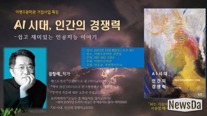 뉴스다 최광묵 기자 | 기술이 인간의 일터를 대체하는 시대, 그러나 여전히 인간만이 가진 감성과 사유의 힘을 강조하는 목소리가 있다. 이병주문학관은 오는 11월 8일 오후 3시, 강창래 작가를 초청해 ‘AI시대, 인간의 경쟁력 – 쉽고 재미있는 인공지능 이야기’라는 주제로 특별 강연을 연다.