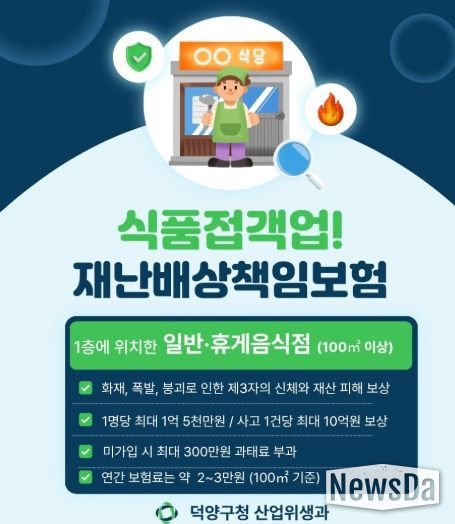 뉴스다 최광묵 기자 | 고양특례시 덕양구는 겨울철 화재 등 재난 사고에 대비해 식품접객업소를 대상으로 ‘재난배상책임보험’가입을 적극 안내하고 있다.