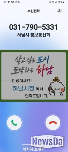 뉴스다 최광묵 기자 | 하남시는 공무원 행정전화 발신 시, 시민의 스마트폰 화면에 ‘하남시청 과’ 등 전화번호와 부서명이 함께 표시되는 ‘행정전화 발신정보 알리미 서비스’를 도입했다고 7일 밝혔다.
