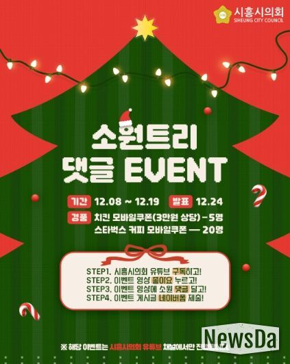 뉴스다 최광묵 기자 | 경기 시흥시의회가 다가오는 성탄절을 맞아 시민들과 따뜻한 마음을 나누고 소통을 강화하기 위해 ‘소원트리 댓글 이벤트’를 진행한다.