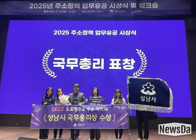 뉴스다 최광묵 기자 | 성남시는 행정안전부가 주관한 2025년 주소정책 업무 평가에서 도로명주소 활성화 분야 우수 지자체로 선정돼 국무총리 기관표창을 수상했다고 19일 밝혔다.