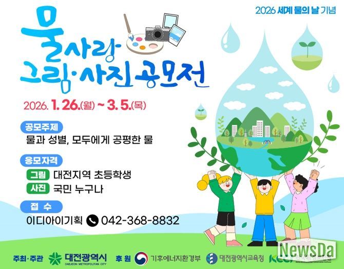 뉴스다 최광묵 기자 | 대전시는 ‘세계 물의 날(3월 22일)’을 맞아 물 환경에 대한 관심을 높이고 수자원의 중요성을 알리기 위해 ‘물사랑 그림․사진 공모전’을 개최한다.