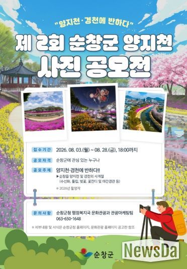 뉴스다 최광묵 기자 | 순창군이 지역의 대표적인 자연경관 자원을 전국에 알리기 위해 ‘양지천·경천에 반하다’ 제2회 순창군 양지천 사진공모전을 개최한다.