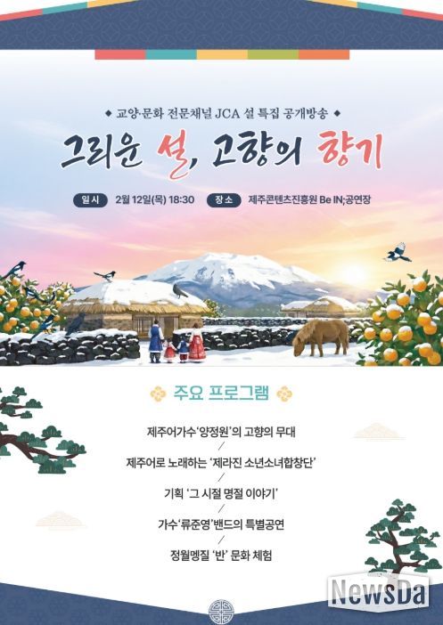 제주콘텐츠진흥원은 제주 교양·문화 전문채널 ‘JCA’를 통해 설 특별 공개방송 '그리운 설, 고향의 향기'를 2월 12일, 오후 6시 30분에 생방송으로 진행한다고 밝혔다.