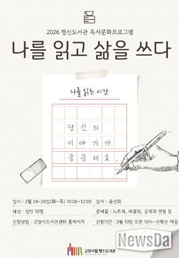 뉴스다 최광묵 기자 | 고양특례시 행신도서관은 일반 성인을 대상으로 하는 글쓰기 프로그램 ‘나를 읽고 삶을 쓰다’를 운영한다.