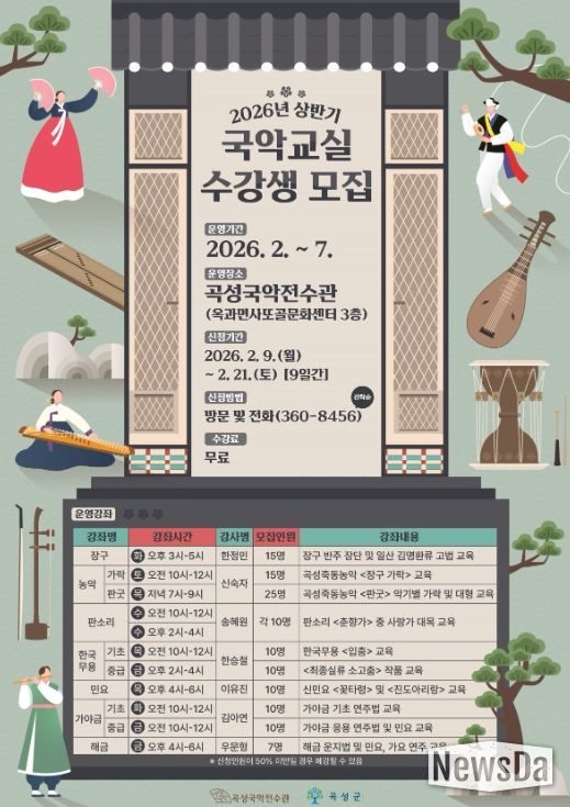 뉴스다 최광묵 기자 | 전남 곡성군은 곡성국악전수관에서 운영하는‘2026년 상반기 국악교실’수강생을 모집한다고 6일 밝혔다.